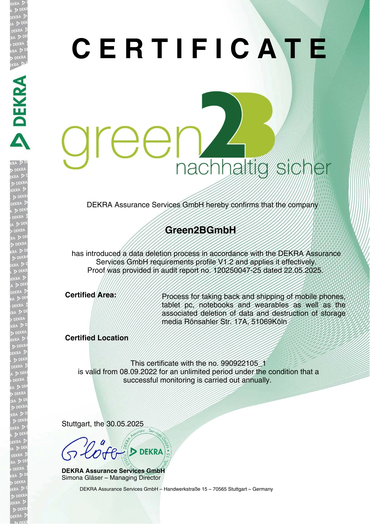 Für die BSI-Konforme Löschung Ihrer Dienstgeräte nutzt Green2B die Löschmethoden NIST Purge, NIST Clear sowie BSI-GSK, welche alle im Einklang mit dem Grundschutz-Kompendium stehen. End-Of-Life Geräte, die für das Recycling bestimmt sind, werden gemäß DIN 66399 fachgerecht vernichtet – sprich geschreddert. Mit Green2B schützen Sie Ihre sensiblen Daten und agieren im Einklang mit Ihren Datenschutzrichtlinien. Durch die Dekra wird dieser Anspruch jährlich auditiert.